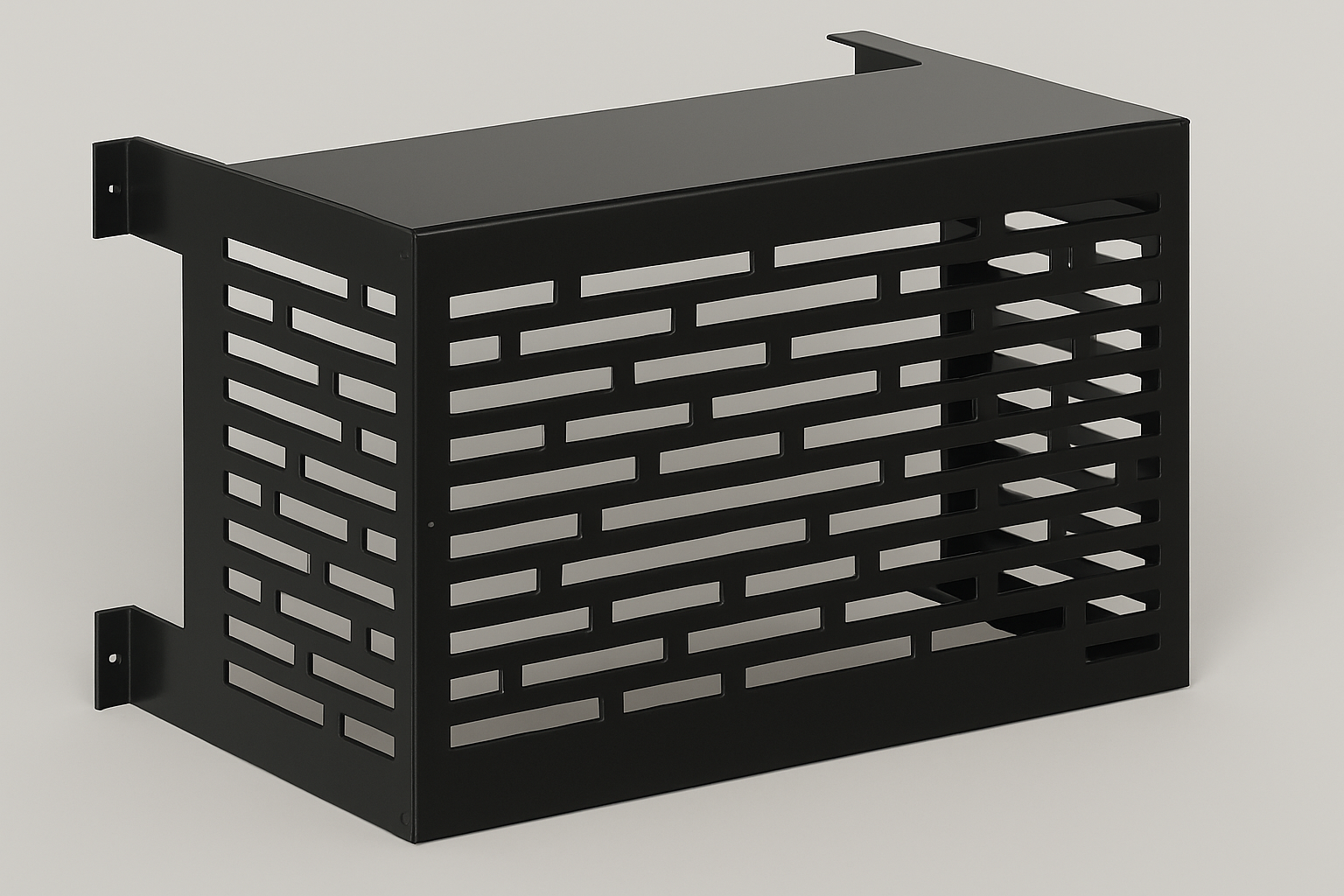 Protetor de ar-condicionado V-BRICK split preto em ACM da Mettalic Service. Estrutura resistente, leve e de fácil montagem, ideal para condensadoras de 9000 a 12000 BTUs. Design moderno e proteção contra ferrugem.