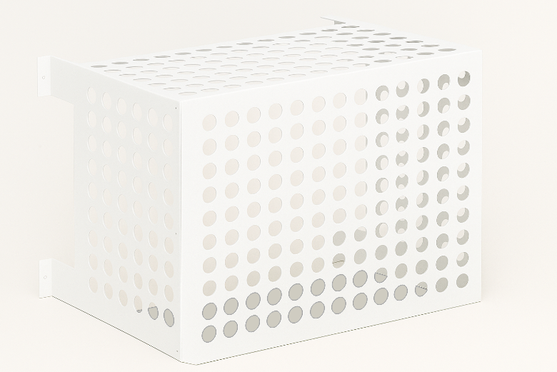 Protetor de ar-condicionado V-DOT split branco em ACM da Mettalic Service. Estrutura resistente, leve e de fácil montagem, ideal para condensadoras de 9000 a 12000 BTUs. Design moderno e proteção contra ferrugem.