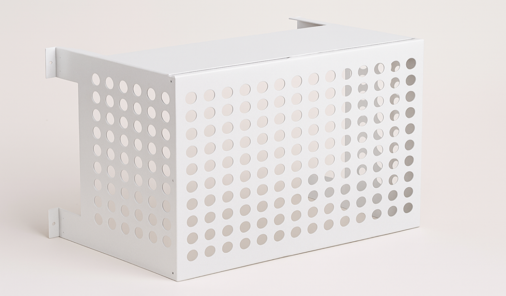 Protetor de ar-condicionado V-DOT split branco em ACM da Mettalic Service. Estrutura resistente, leve e de fácil montagem, ideal para condensadoras de 9000 a 12000 BTUs. Design moderno e proteção contra ferrugem.