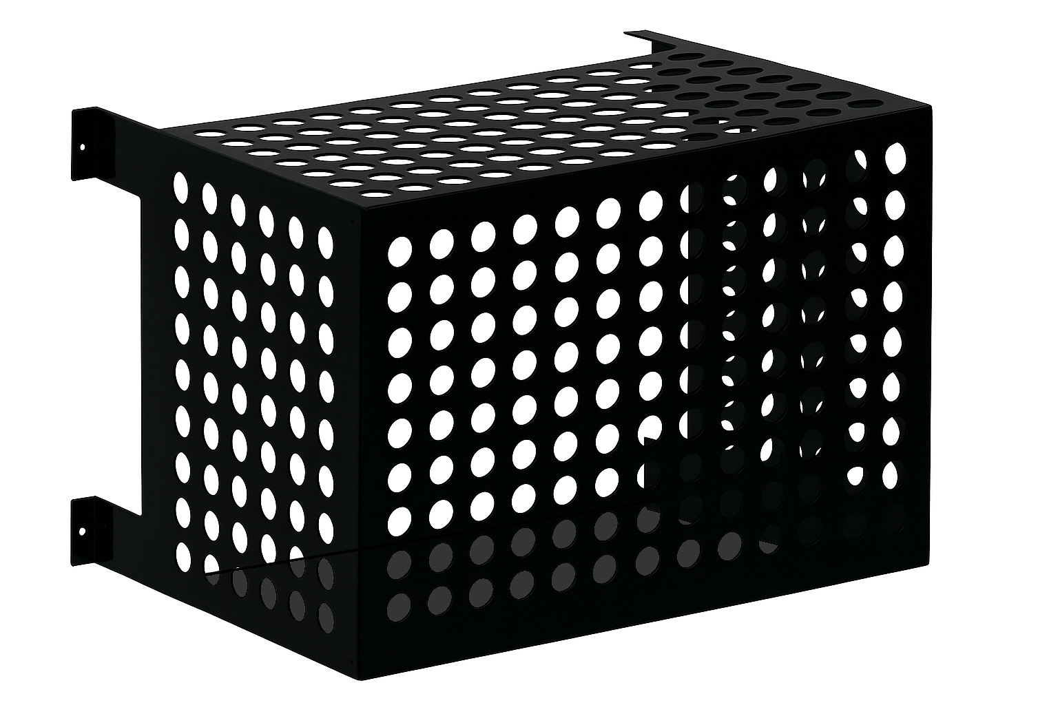 Protetor de ar-condicionado V-DOT split preto em ACM da Mettalic Service. Estrutura resistente, leve e de fácil montagem, ideal para condensadoras de 9000 a 12000 BTUs. Design moderno e proteção contra ferrugem.