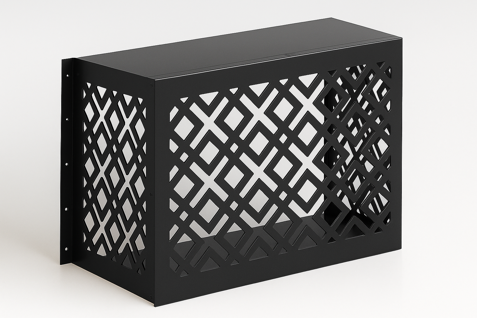 Protetor de ar-condicionado X-RAY janela preto em ACM da Mettalic Service. Estrutura resistente, leve e de fácil montagem, ideal para condensadoras de 9000 a 12000 BTUs. Design moderno e proteção contra ferrugem.